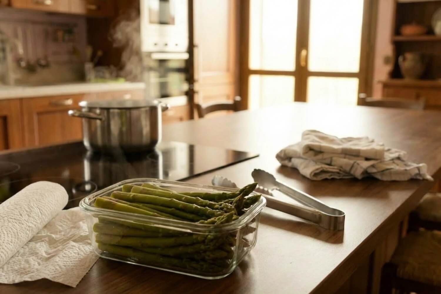 Asparagi cotti in frigo: qui la parola magica è “asciutti”. Cuocili al vapore o in pentola “in piedi”, poi lasciali intiepidire, asciugali bene e riponili in un contenitore con chiusura. Si conservano di solito per 2–3 giorni e ti salvano un pranzo: li ripassi in padella 2 minuti con olio e limone, oppure li usi per una frittata, un risotto, una torta salata. Se vuoi mantenerli più “vivi”, cuocili leggermente meno del punto perfetto: la seconda scaldata li porta alla consistenza giusta senza sfibrarli.