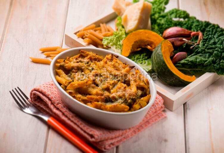 Nella pasta al forno in genere si mettono salsa di pomodoro, formaggi, polpette e affettati. In questo caso, però, propongo un’alternativa light e vegetale, che consta di zucca e foglie di cavolo verza.