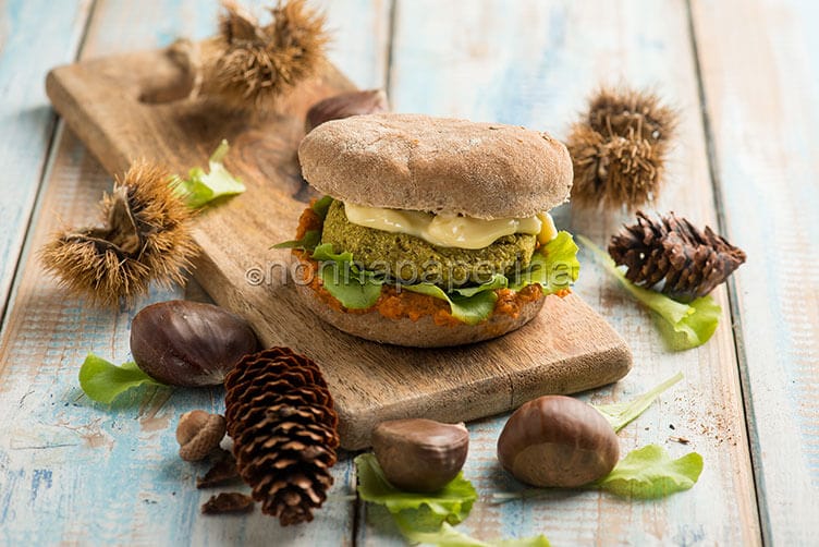 Colpisce anche l’aspetto di questo hamburger di fagioli e patate con hummus di pomodoro. In un certo senso, visti i colori, ricorda molto l’autunno: l’hamburger è verde-marrone, mentre l’hummus è arancione. Spezza il tutto la lattuga, che è ovviamente verde brillante. Inoltre, l’effetto “autunno” è più accentuato se utilizzate del pane integrale.