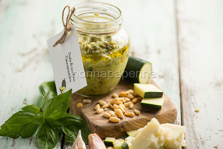 Pesto di zucchine. Si tratta di un pesto particolare, molto più dolce, delicato e soprattutto dietetico. Molti di voi già sanno che le zucchine sono tra gli alimenti meno calorici in natura, dunque vale la pena provare questa variante. Anche perché proprio il pesto di zucchine conferisce ai cannelloni un impatto visivo particolare, una tonalità di verde chiaro che certamente colpisce. Ovviamente, visto che stiamo parlando pur sempre di pesto, è presente anche il basilico, ma non si va oltre il ciuffetto.