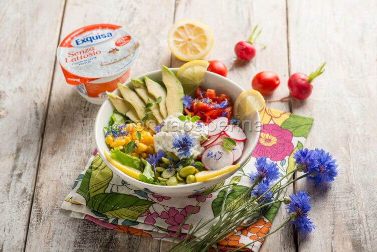 Ora lavate e asciugate l’insalata. Poi pulite i ravanelli e i pomodorini, lavateli e fate i primi a dadini e i secondi a fettine. Irrorate con succo di limone e condite con un po’ di sale e un po’ di olio d’oliva. Fate l’avvocato a metà e riducetelo a fette sottili, poi conditelo con sale e pepe. Finalmente ora potete comporre la bowl. Trasferite all’interno l’insalata condita e unite gli altri ingredienti formando una raggiera, così come vedete in foto. Riservate i fiocchi di latte per la fine, ponendoli al centro. Guarnite con un paio di fettine di limone e 2-3 fiordaliso.