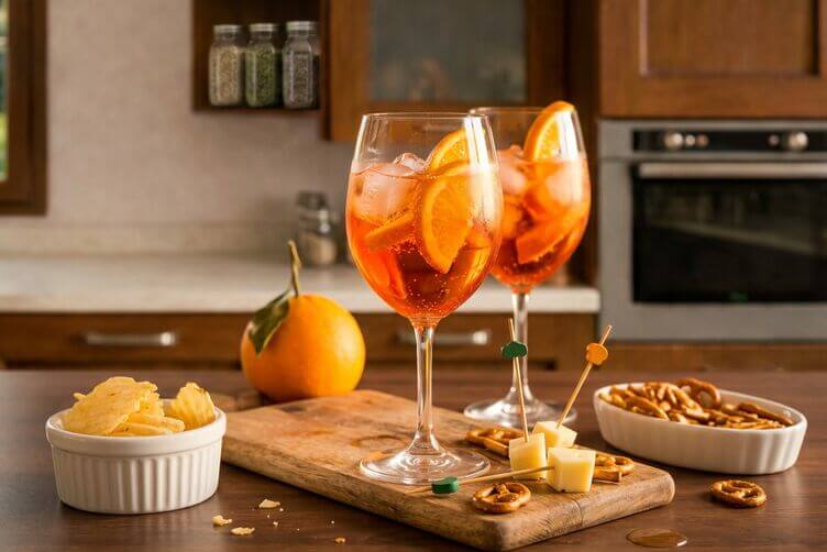 Con l’Aperol Spritz funzionano bene piccoli assaggi salati: olive, mandorle tostate, chips artigianali, crostini con hummus, focacce leggere e bocconi con ortaggi grigliati. Il cocktail chiede cibo snello, non sapori troppo forti.