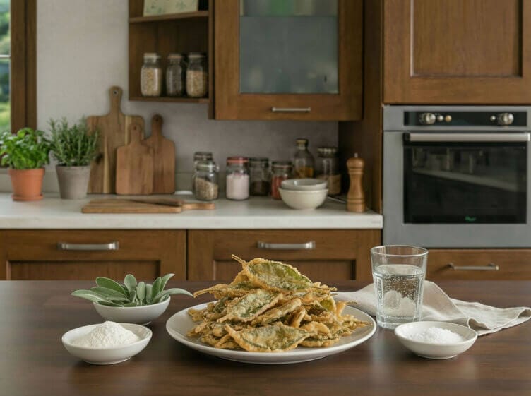 L’acqua deve essere molto fredda, quasi gelata. Questo piccolo accorgimento aiuta a creare uno shock con l’olio caldo e dà una frittura più ariosa. Anche la consistenza va tenuta d’occhio: la pastella non deve essere dura né troppo lenta. Deve velare la foglia senza creare uno strato pesante, altrimenti il gusto della salvia si perde.