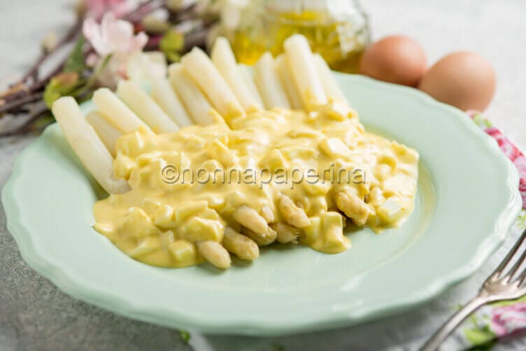 Per quanto concerne le uova, è necessario farle rassodare in acqua bollente. Il tempo medio è 7-8 minuti dalla bollitura, che diventano 9 se l’uovo è grande. L’accorgimento più importante riguarda in realtà il post-cottura. Appena scolate, le uova vanno poste in acqua ghiacciata, per fermare la cottura. Solo in questo modo possono mantenersi sode e quindi servire allo scopo. Per inciso, le uova sode vengono poi sgusciate, tagliate in due e frullate insieme all’olio e all’aceto. La fase finale della ricetta prevede la sistemazione degli asparagi nei piatti di portata e la distribuzione della crema di uova.