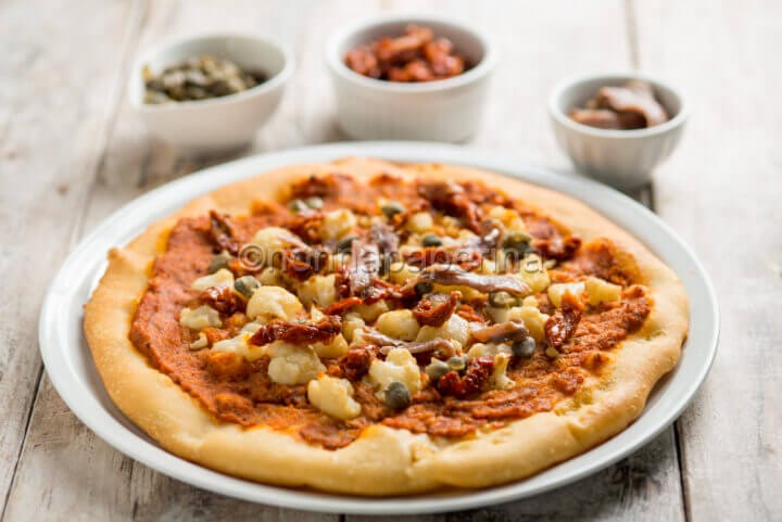 Adesso non rimane che comporre la pizza. Stendete le basi per pizze in due teglie, distribuite sulle loro superficie l’hummus, poi aggiungete le cimette di cavolfiore e condite con due cucchiai di olio extravergine di oliva. Cuocete al forno a 220 gradi per 20 minuti circa. Infine guarnite con i pomodorini sott’olio, le acciughe e i capperi. Servite le pizze ben calde e buon appetito.