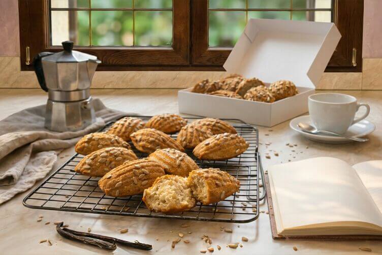 Madeleine al teff per chi vuole dolcetto soffice senza glutine e senza lattosio con vaniglia e semi di girasole.