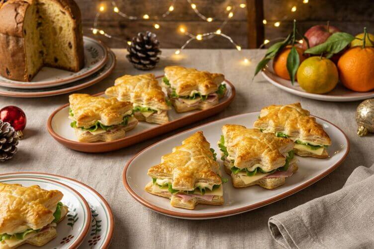 Questi alberelli di sfoglia funzionano bene sia in un pranzo tradizionale, serviti come antipasto, sia in un contesto più informale, come un aperitivo lungo o una cena a buffet. La forma tematica richiama immediatamente il Natale, mentre la farcitura “da tramezzino” li rende familiari e rassicuranti anche per i palati più semplici. Bastano pochi pezzi ben disposti su un vassoio per dare subito l’idea di festa, senza ricorrere a preparazioni complesse o a tempi di lavoro eccessivi.
