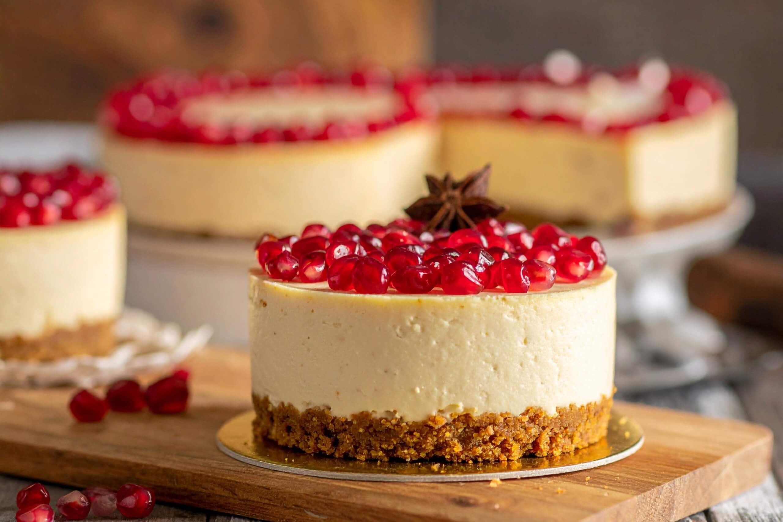 - Cheesecake speziata: base senza glutine, crema delattosata, melograno lucido.