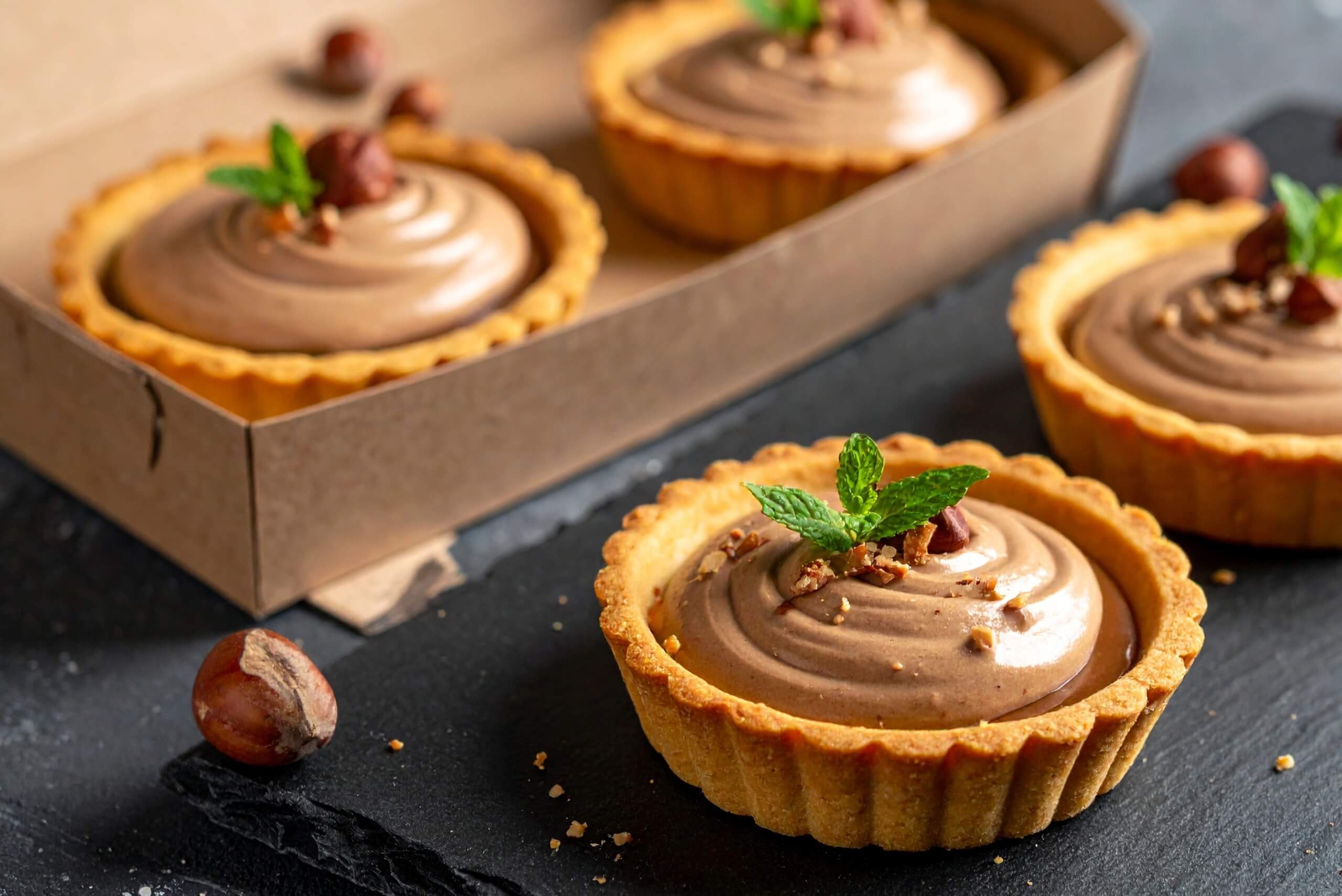 Per creme e mousse, vaschette compostabili con coperchio trasparente; per crostatine e brownies, scatoline rigide con finestra. Etichette chiare con ingredienti, allergeni e data.