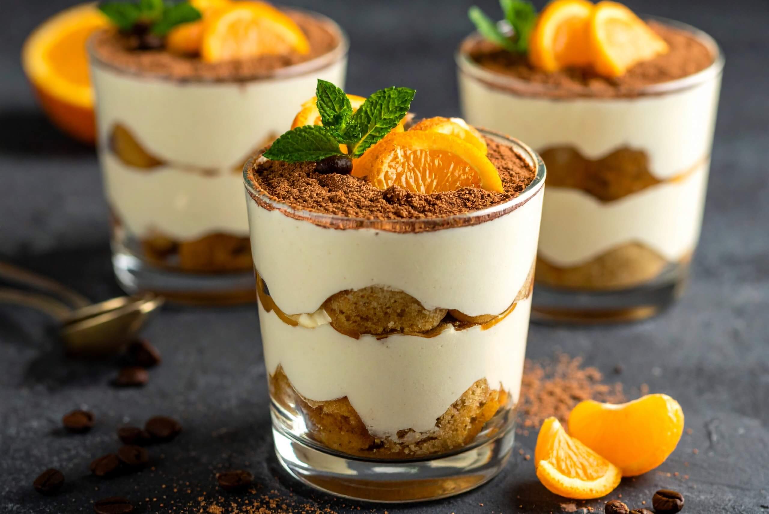 - Tiramisù in bicchiere: savoiardi senza glutine, profumo d’arancia.